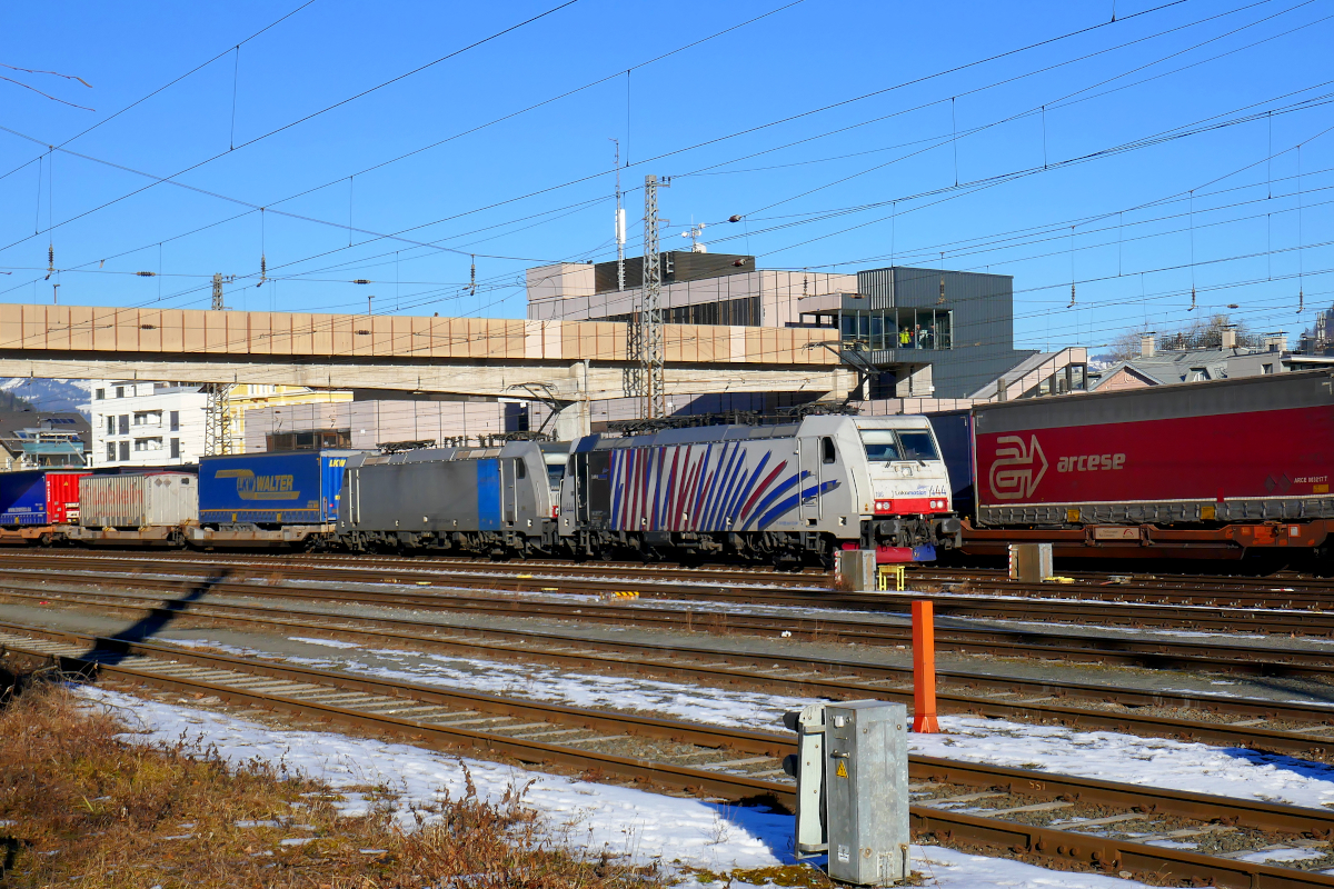 Die Lokomotiven 186 444 der Lokomotion und eine unbekannte 186 von Railpool stehen abfahrbereit mit einem langen Zug des kombinierten Verkehrs in Kufstein. Am Zugschluß hängt - hier nicht sichtbar - die 185 526 von Alpha-Trains. Kufstein, Tirol, 14. Januar 2022