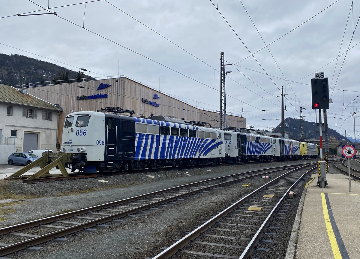 Lokomotion aus Deutschland ist in Kufstein Österreich gut vertreten und hat hier ein Lokschuppen. Vom Parkplatz des Baumarkts gegenüber fotografiert mit schönem Hintergrund am 4 April 2023.
