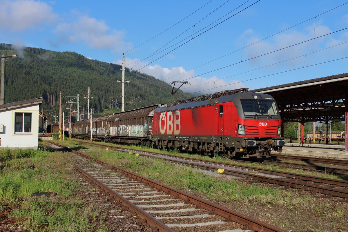 Am angenehm warmen 1.6.2025 fuhr die 1010.10 mit einem Sonderzug von Wien Nußdorf nach Bad Aussee zum jährlichen Narzissenfest hier im Bahnhof Selzthal beim Stürzen des Zuges.