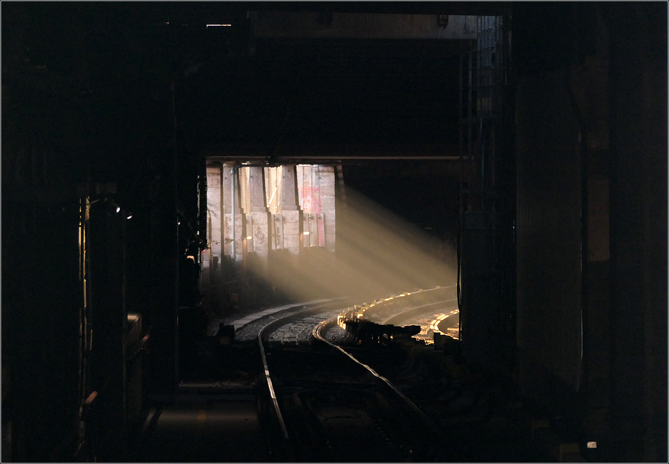 Ein Blick vom Bahnsteig der U4-Station Friedensbrücke in den Tunnel Richtung Roßauer Lände. Der Tunnel aus der Stadtbahnzeit entlang des Donaukanals ist zum Kanal immer wieder galerieartig geöffnet. Hier fällt das Licht der tiefstehenden Sonne auf die U-Bahngleise.