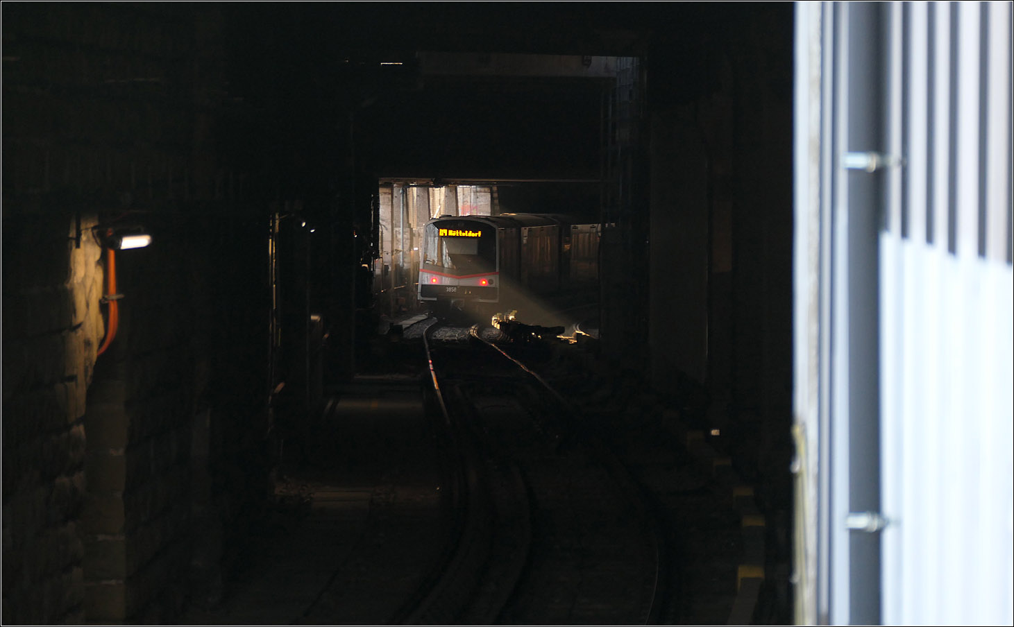 Der V-Zug auf der U4 entschwindet im Tunnel mit seitlicher Galerie zum Donaukanal in Richtung Rossauer Lände. Er fährt immer noch auf dem linken Gleis, der Gleiswechsel liegt wohl hinter der Biegung.
