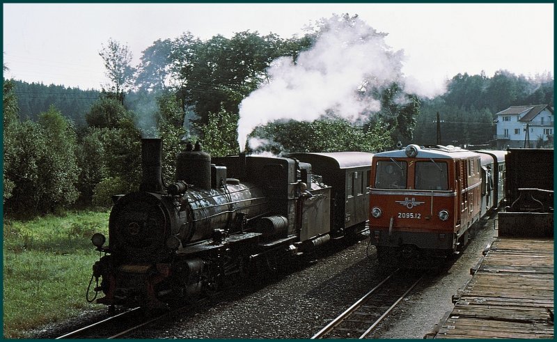 399.02 erhält Vorspann durch die 2095.12 in Alt Nagelberg. Ob es nur eine Überfuhr war oder wegen der Steigung vor dem Bahnhof Gmünd, weiss ich nicht mehr. (Archiv 09/75)