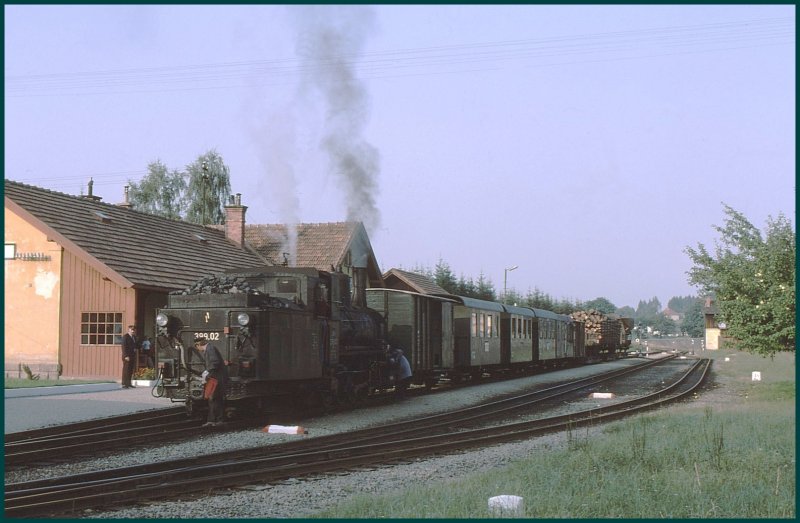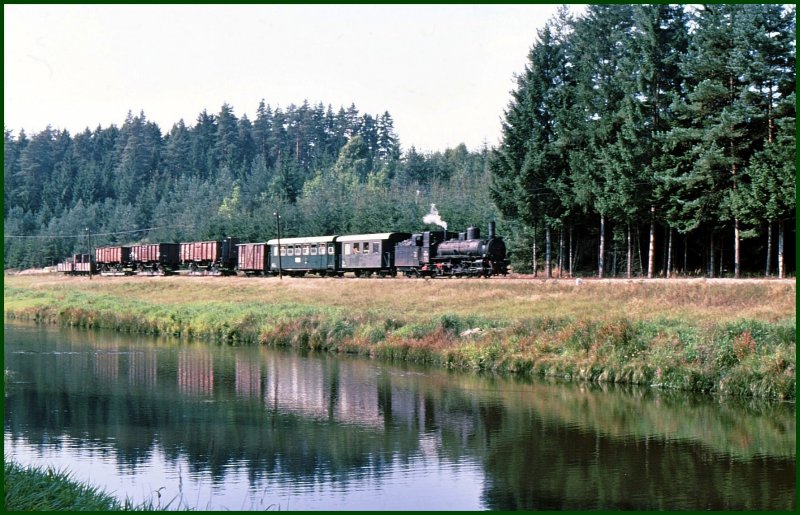 Kurz vor Alt Nagelberg passiert dieser gemischte Zug einen Fischteich. 399.02 zieht an diesem Nachmittag eine beachtliche Last bestehend aus einem 2achsigen und einem 4achsigen Personenwagen, einem zweiachsigen Übergangswagen, dann drei geschemelte E-Wagen (davon einer mit Bremserhütte) und zwei dreiachsigen leeren Holzwagen, ebenfalls mit Bremserhütte. (Archiv 09/75)