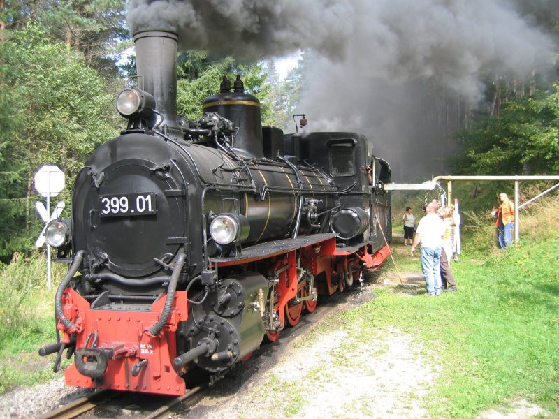 Stütztenderlok 399.02 und ihr Personal machen eine kleine Pause in Alt Nagelberg. (Archiv 09/75)