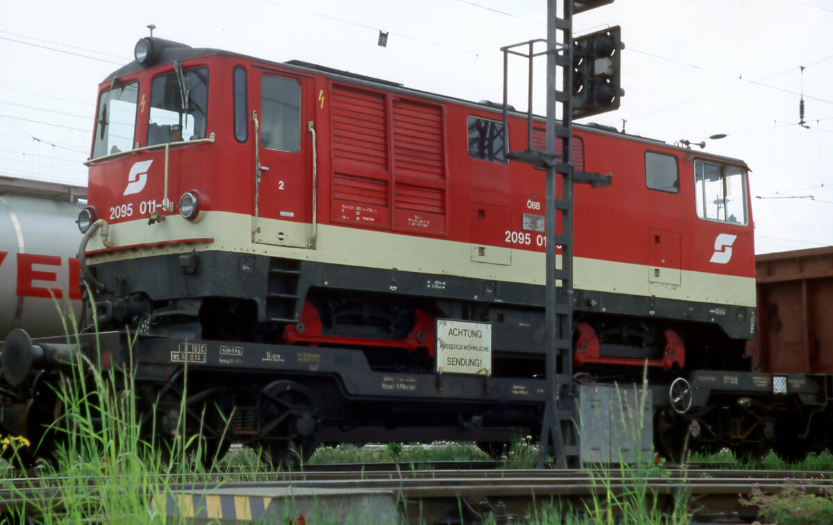 Als Ersatz für einen 5090er fährt im Sommer 1986 die die 2095.04 mit lediglich einem Personenwagen als Abendzug von Fassl nach Brunn am Berg hier vor der Abfahrt in Trassdorf. Max Kiegerl