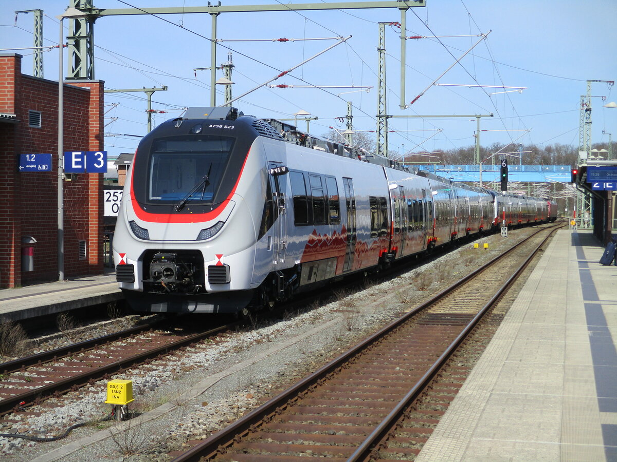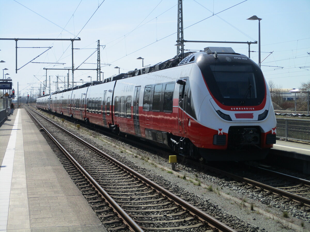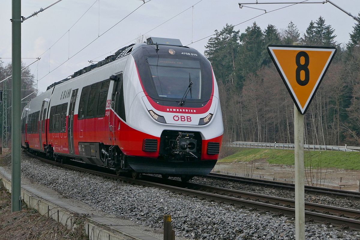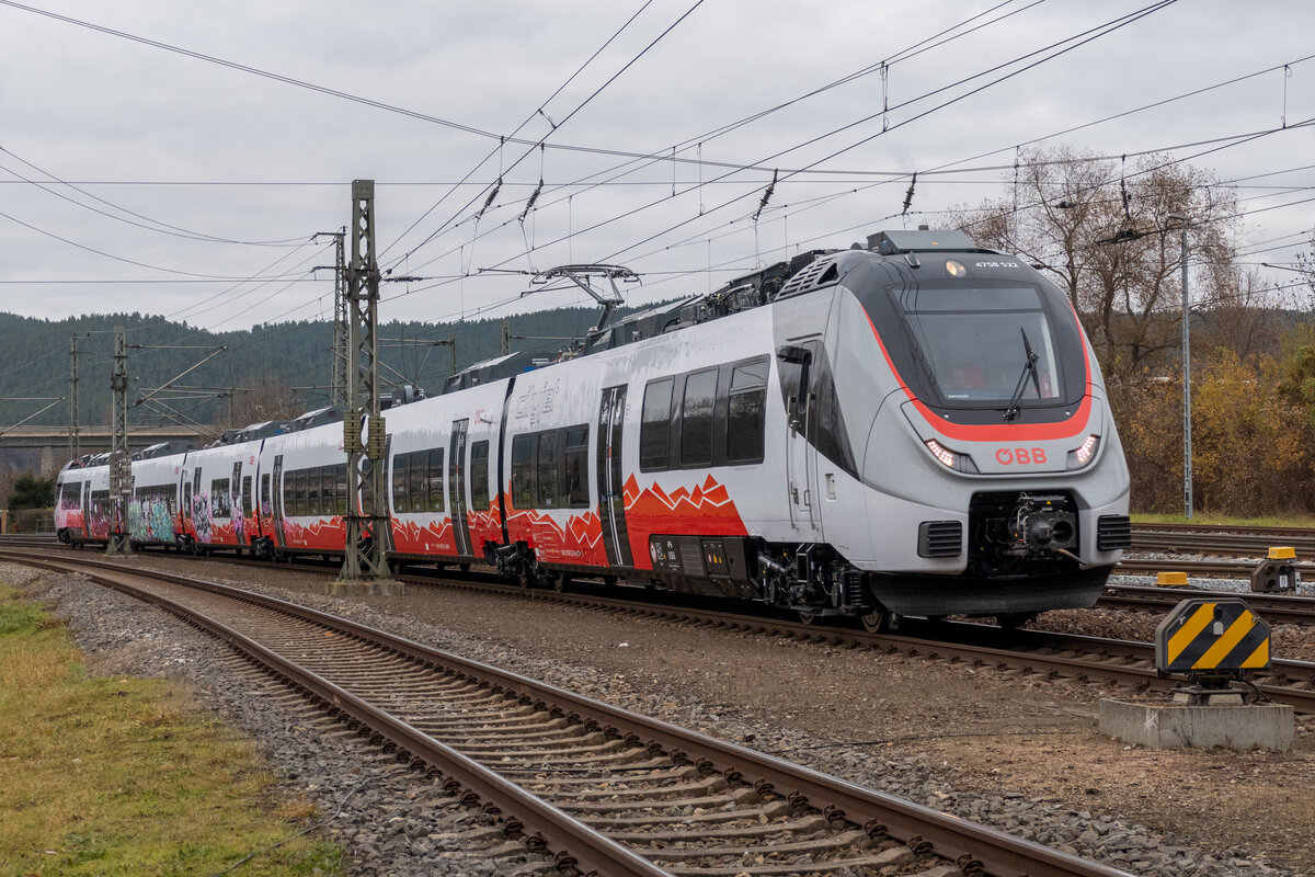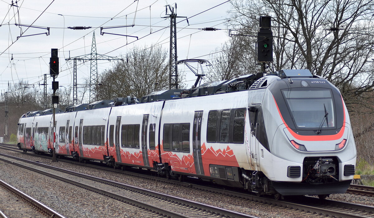 Ein österreichischer Talent 3 Triebzug "4758 522" (NVR: 94 81 4758 522-8 -----......) ohne Eignerkennung und mit reichlich Graffiti beschmiert fuhr überraschend am 29.03.23 durch den Bahnhof Saarmund in nordwestlicher Richtung. Lothar Stöckmann