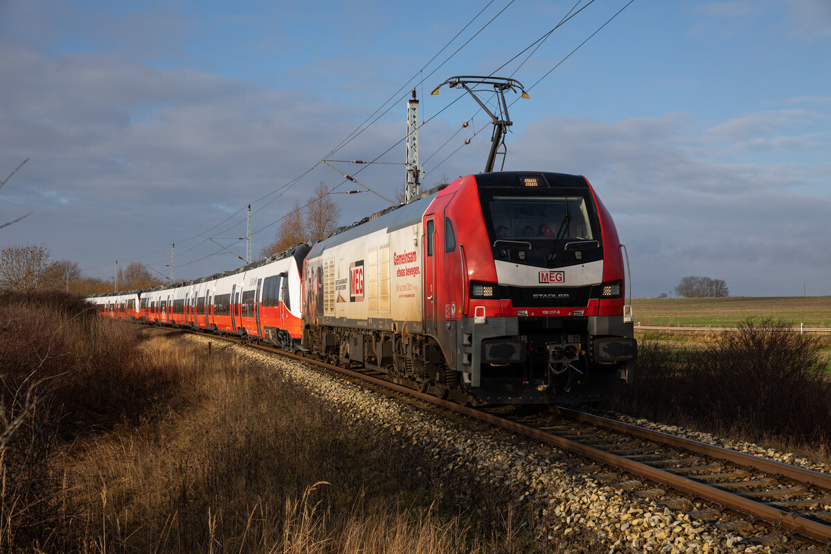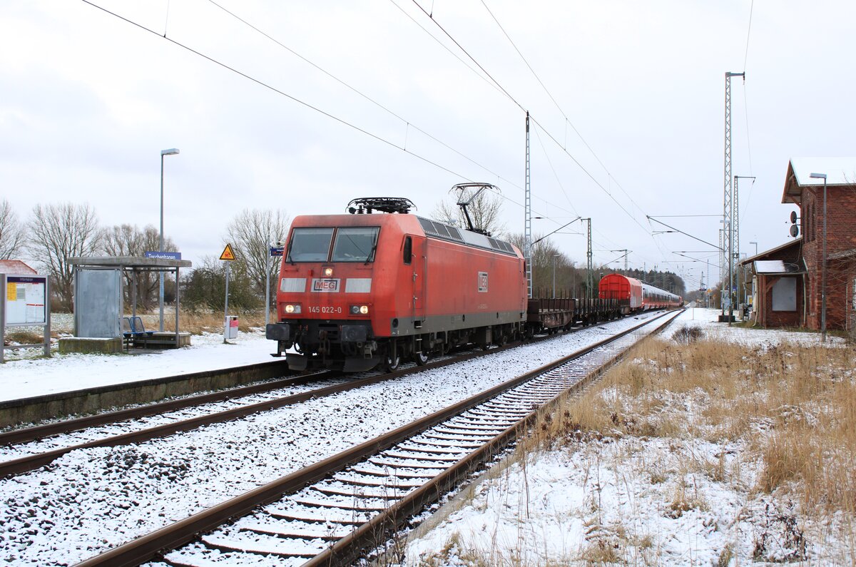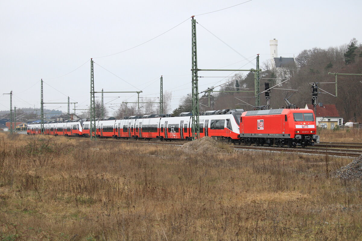 Am 01.02.2022 überführte die MEG mit der von Cargo gemieteten 145 022, zwei weitere Talent 3 Triebzüge, von Bautzen nach Mukran. Somit sind nun schon vier Einheiten in Mukran. Da die Züge von ihrem eigentlichen Besteller wohl nicht mehr abgenommen werden, kommen sie nach Mukran, um dort fit für einen Verkauf gemacht zu werden. Hier zu sehen die Fuhre, bei der Durchfahrt in Teschenhagen. Cordel Schwella
