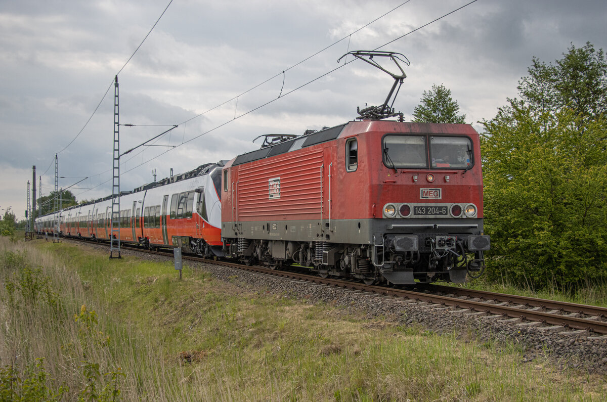 Am 25.05.2022 gab es die letzten 2 Bewegungsfahrten der Talent 3 Triebzüge, gezogen von MEG 143 204 zwischen Mukran und Bergen. Aufgenommen im Bft Mukran West. Cordel Schwella
