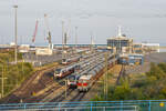 Im Fährhafen Mukran stehen die letzten Loks (19x Baureihe 139 & 140, 2x Baureihe 155) vom SSM Mukran und die 2 Talent 3 Triebzugeinheiten abgestellt. Rechts im Bild steht noch die 346 975 bei der Mittagspause an der Getreideentladung. Aufgenommen am 21.01.2022 von der Straßenbrücke.