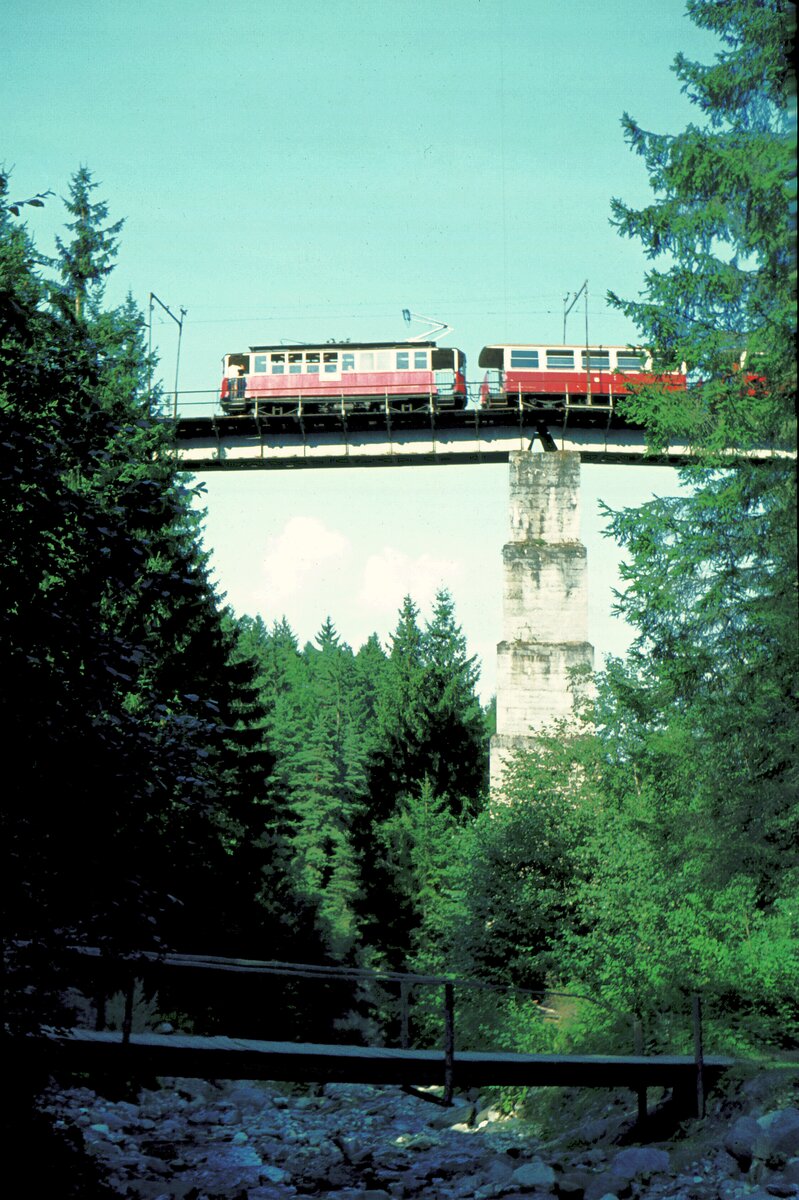 Stubaitalbahn__Zug auf der Mutterer Brücke (Mühlgrabenviadukt). Seit 2017 fahren die Garnituren der Stubaitalbahn über eine neue Brücke mit geänderter Streckenführung.__18-08-1973