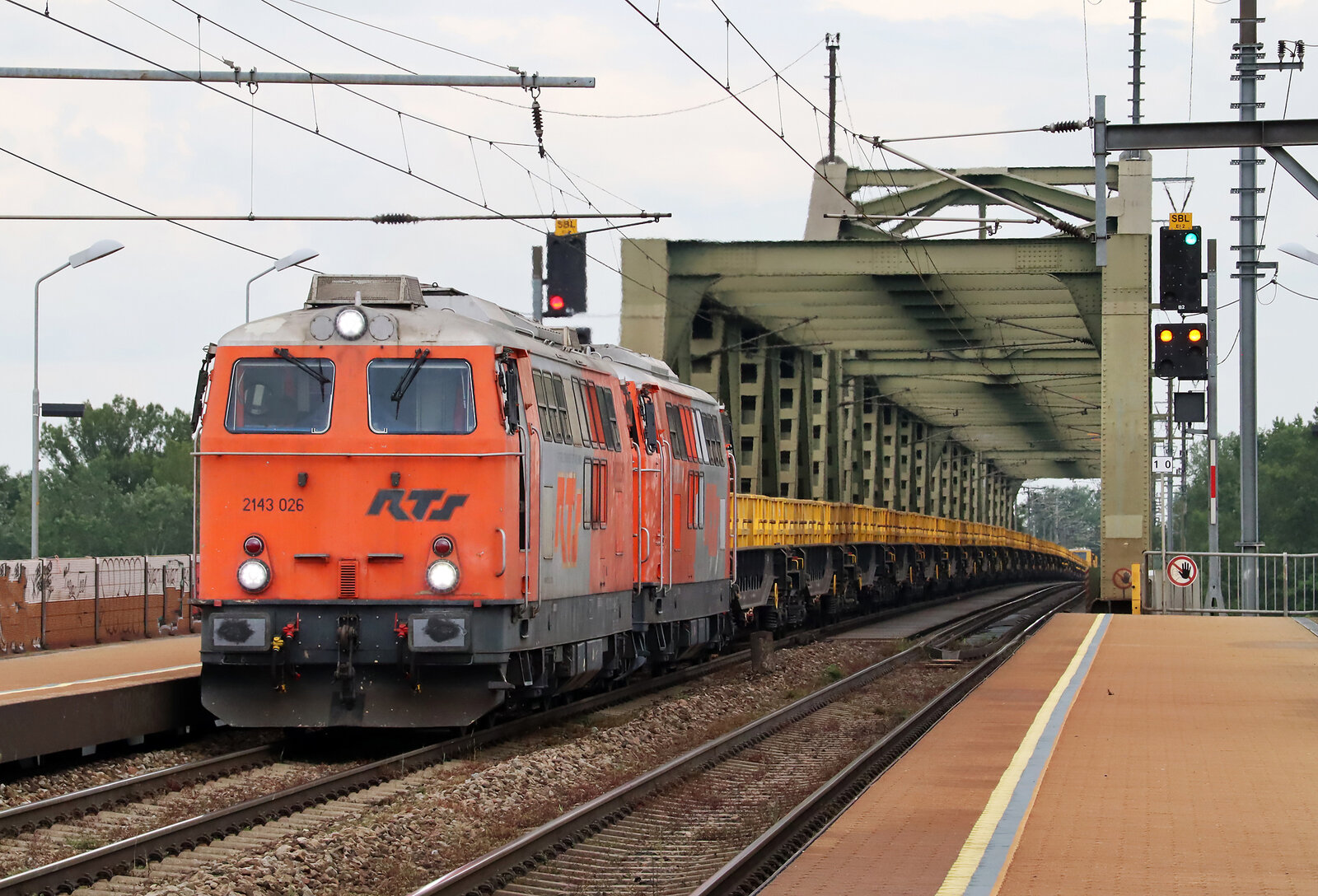 Doppeltraktion der RTS BR 2143 mit leeren Wagen überquert auf der Stadlauer Ostbahnbrücke die Donau und durchfährt die Station Wien Praterkai. Wien, 10.6.2023
