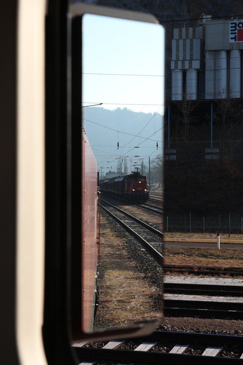 aus der 2016 092 auf die 1063 022 mit dem SNG91961 von Graz Vbf nach Frohnleiten bei der Durchfahrt in Peggau-Deutschfeistritz am 8.2.2020. Max Kiegerl