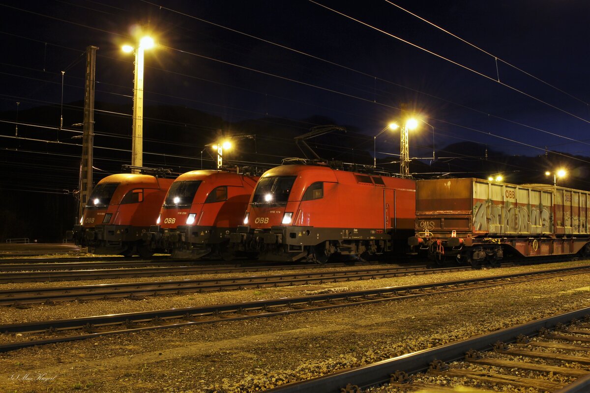 So stehen die 1016 034 mit dem SD54456 Villach Süd Gvbf - Hall in Tirol, 1116 259 mit dem SGAG47204 Tarvisio Boscoverde nach Steindorf bei Straßwalchen und die 1116 176 mit dem SDG91511 von Wels Vbf nach Villach Süd Gvbf am frühen Morgen des 21.4.2023 in Selzthal nebeneinander. Max Kiegerl