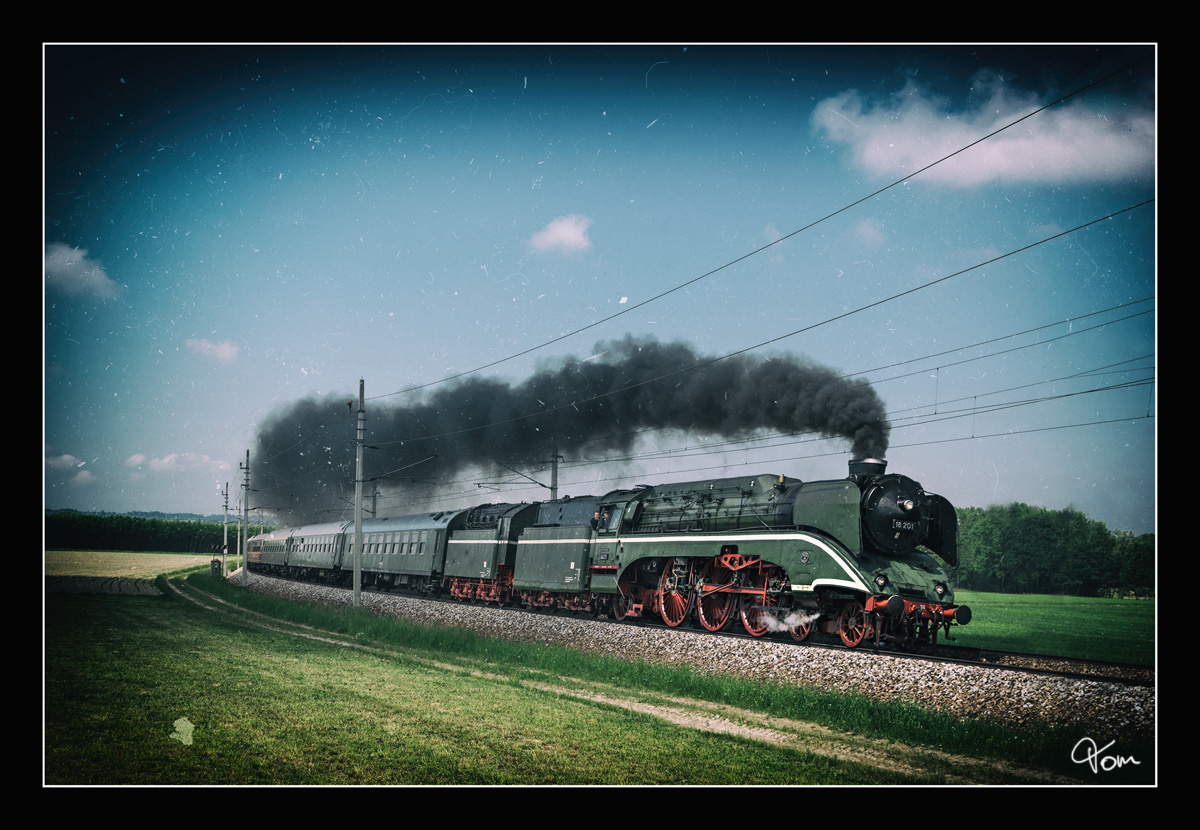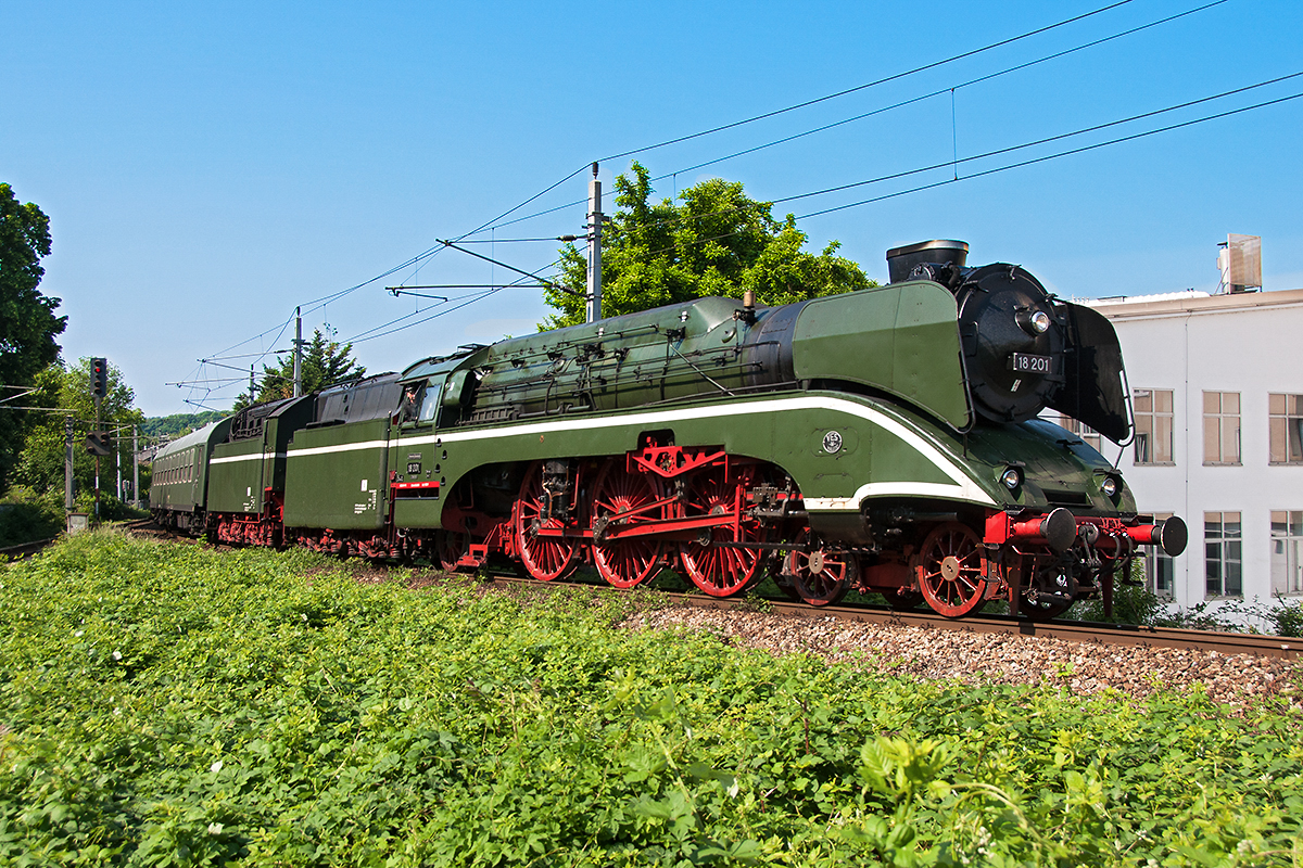 Die wunderschöne DR 18.201 fährt mit dem Sonderzug SR 19783 von Passau Hbf nach Wien Hbf, aufgenommen nahe Kumpfmühl auf der Passauerbahn. Die Schnellzuglokomotive 18.201 der Deutschen Reichsbahn entstand 1960 bis 1961 im Reichsbahnausbesserungswerk Meiningen, aus Teilen der 61 002, dem Schlepptender der 44 468 Teilen der H 45 024 und einer Lokomotive der Baureihe 41. Mit 182,4 km/h Höchstgeschwindigkeit, ist sie die schnellste betriebsfähige Dampflok der Welt.(Quelle Wiki)