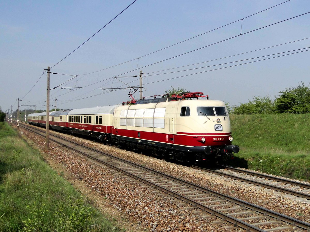 Ein seltener Gast auf der Nordbahn in Österreich: 103 235 mit dem TEE Rheingold Express von Wien nach Strasshof bei Helmahof. 25.04.2010.