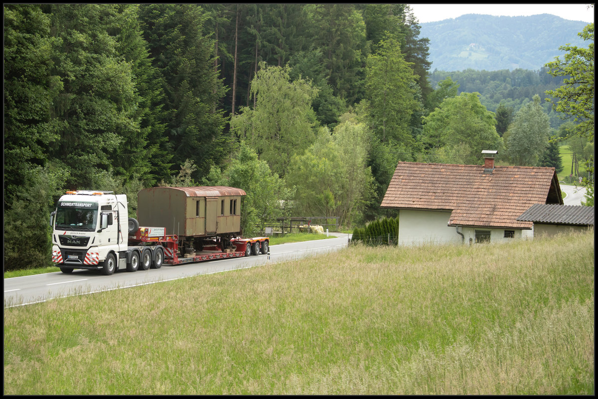Am 29.Mai 2020 rollte ein Tieflader mit dem Dienstwagen PWI 133 vorbei am einzig verbliebenen Gebäude dieser Strecke Richtung Wies.