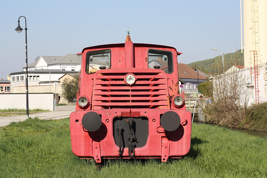 Auf einem Gleisrest der ehemaligen Anschlussbahn der ÖSPAG in Wilhelmsburg steht die JW DH200 B26T. Die Lok mit der Fabriksnummer 3.511.028, Baujahr 1961, kam 1996 vom Konsum Liesing zur ÖSPAG. Bild vom 19.April 2015. Karl Seltenhammer