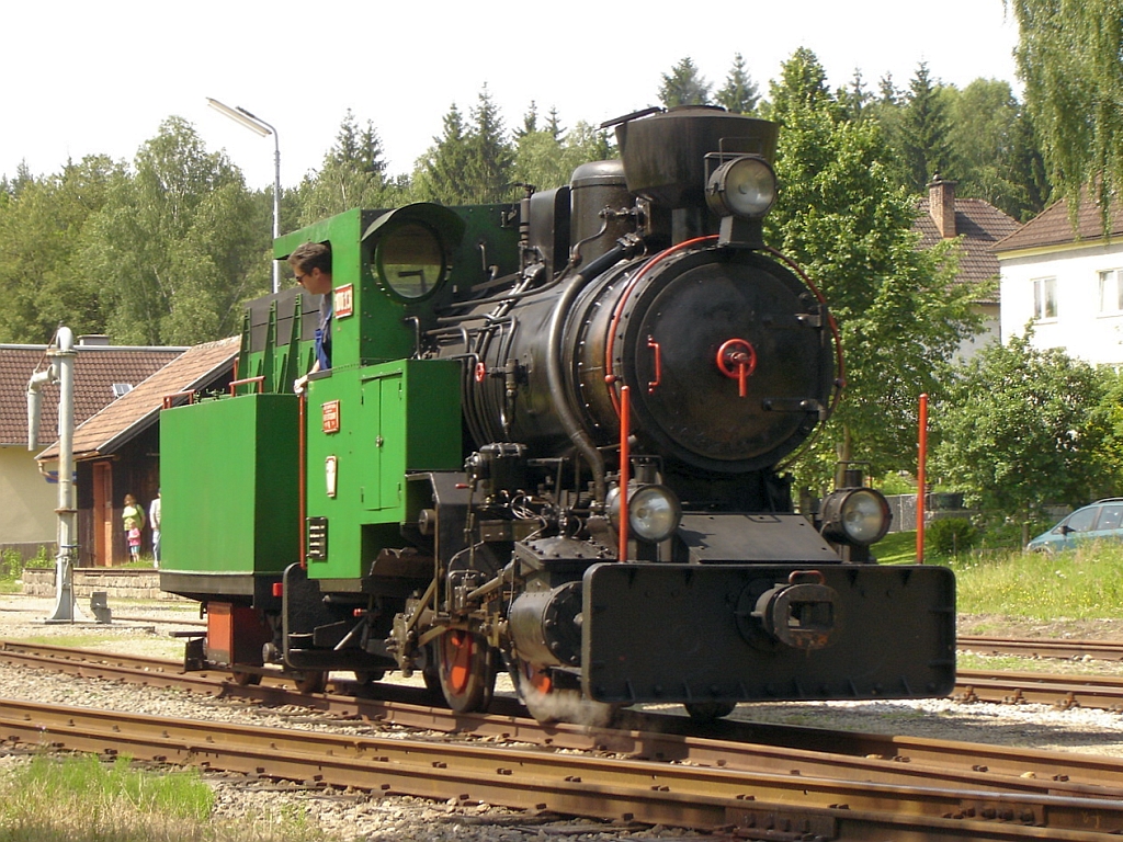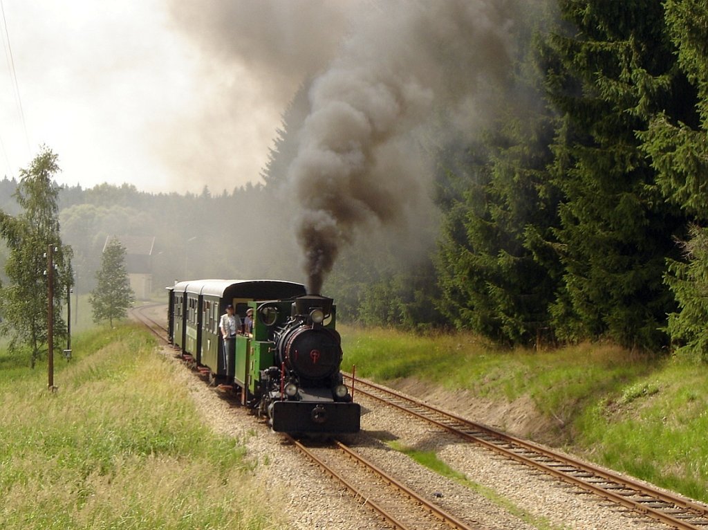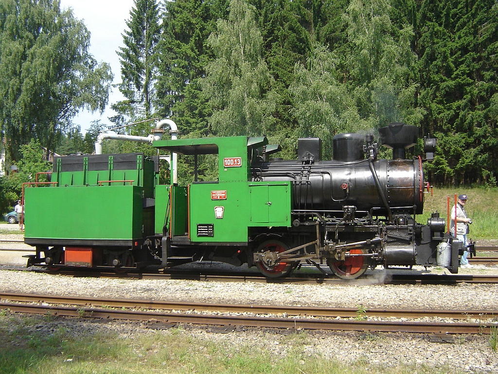Die Leihgabe-Lok 100.13 hat am 16.Juli 2005 den Bf. Alt Nagelberg mit Planzug nach Heidenreichstein verlassen. Das zweite Gleis im Bild ist die Strecke Gmünd N.Ö. - Litschau.