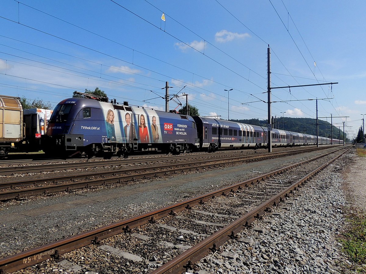 ÖBB 1116 232 mit den ORF Reiljet Garnitur 32 als RJ 537 von Wien Hbf nach Villach Hbf bei Pfaffstätten, 16.08.2016.