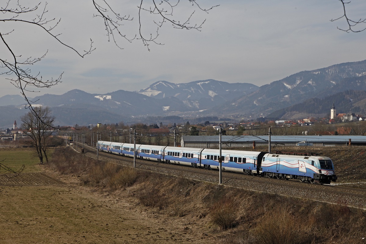 Panoramaaufnahme der 1116 251, welche mit dem "SKI AUSTRIA" railjet 534 von Villach nach Wien Meidling unterwegs war. Im Hintergrund sieht man die Seetaler Alpen mit dem 2396m hohen Zirbitzkogel.