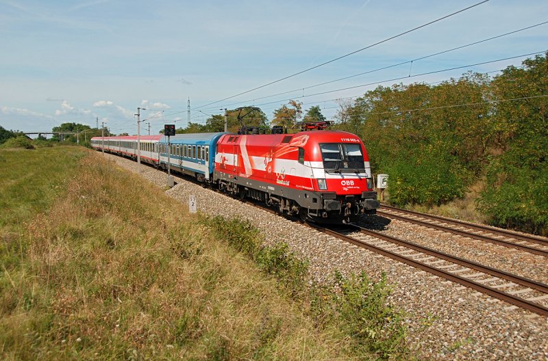 1116 005 "Länderlok Österreich" beförderte am 30.08.2009 den EC 961 "Franz Liszt" nach Budapest keleti pu. Die Aufnahme entstand nach Parndorf. Gerhard Zant