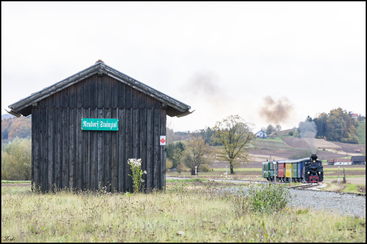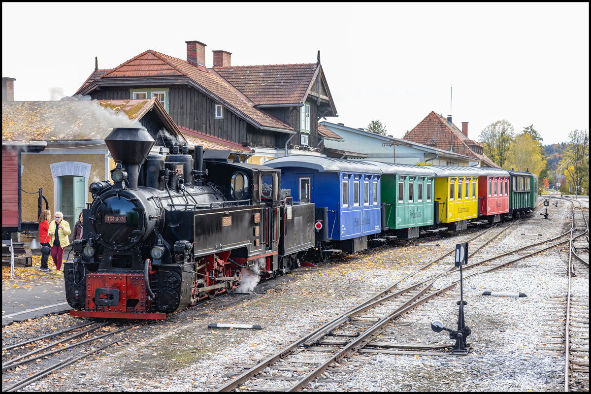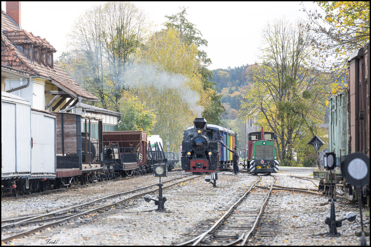 Der einzige Kreuzungsbahnhof an der Strecke der Stainzer Lokalbahn is Kraubath. Hier wird für Fahrgäste des "Flascherlzug" auch für das leibliche Wohl gesorgt. Am herbstlichen 8.11.2025 rollt die D8 in mit einem Fotozug in den Bahnhof Kraubauth.