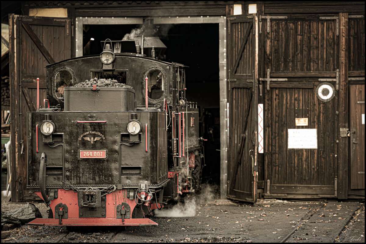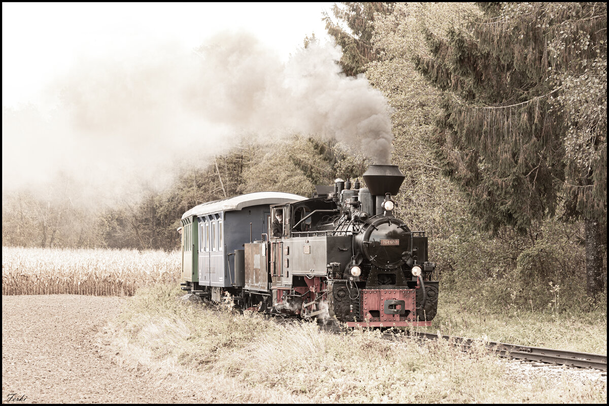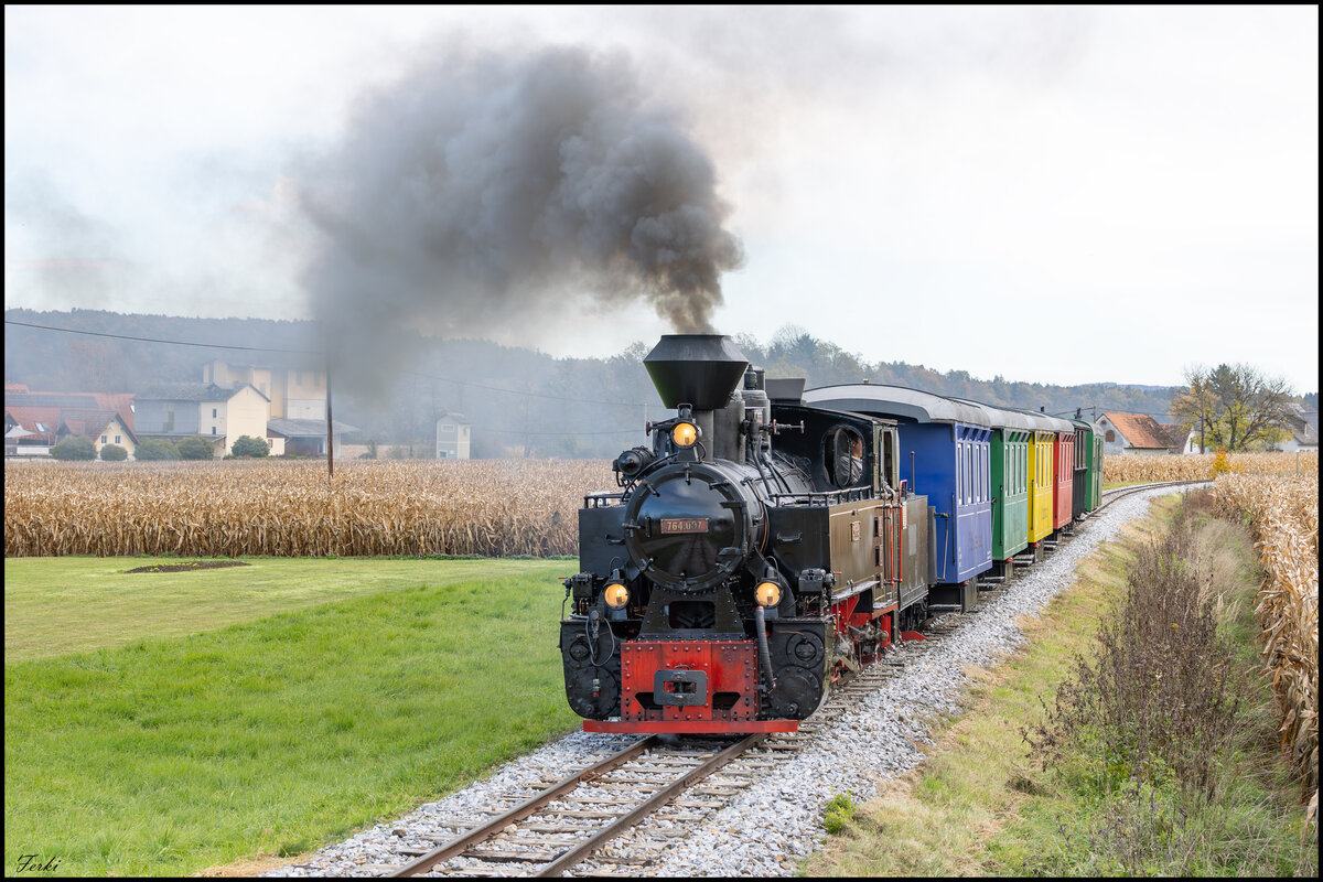 Die 764.007 kam 2018 von der Steyrtalbahn nach Stainz zur Stainzerbahn. Sie wurde ursprünglich 1958 für die rumänischen Walbahnen CFF (Căile Ferate Forestiere) gebaut. Am 8.11.2025 fährt die Lok mit dem Spitznamen "Maxi" mit den vier Haubendachwagen sowie einem Gepäckwagen von Preding-Wieselsdorf nach Stainz.