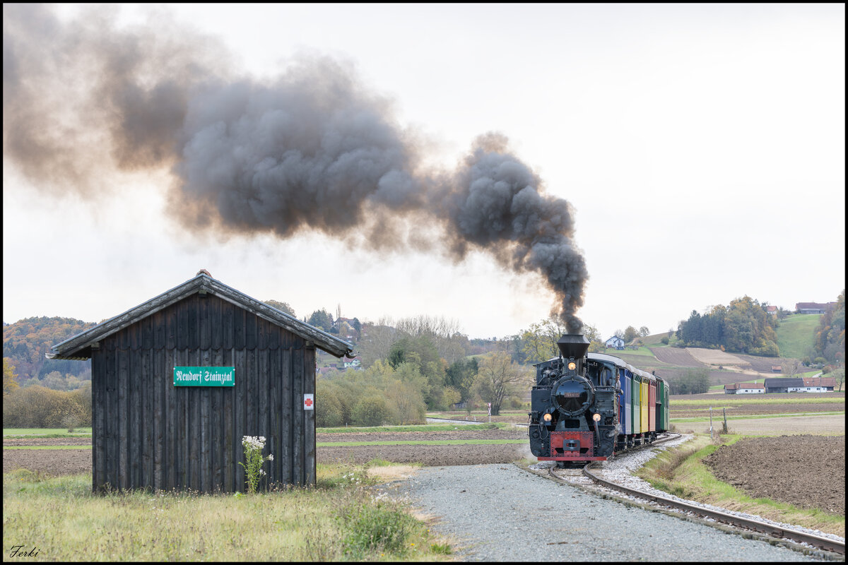 Durch das hügelige Stainzertal führt von Preding-Wieselsdorf nach Stainz die ca 11km lange Stainzer Lokalbahn. Auf ihr verkehrt der weit bekannte "Flascherlzug" mit den bunten Wagen. Der Name "Flascherlzug" kam von den Reisenden, die mit ihren Fläschchen zum Wunderdokter "Höller Hansl" nach Rachling bei Stainz pilgerten um Krankheiten im mitgeführten Urin diagnostizieren zu lassen. Die ehemalige Zillertalbahn D8 fährt hier am 8.11.2025 bei Neudorf ihrem Ziel Stainz entgegen.