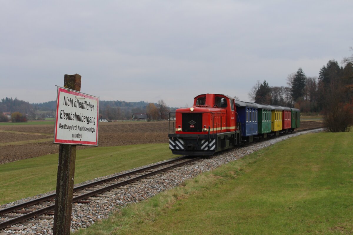 Für eine Gruppe Fotografen fuhr am 8.11.2025 die ehemalige Zillertalbahn D8 mit der Garnitur des  Flascherlzug  auf der Stainzer Lokalbahn von Stainz nach Preding-Wieselsdorf und zurück hier kurz hinter Stainz.