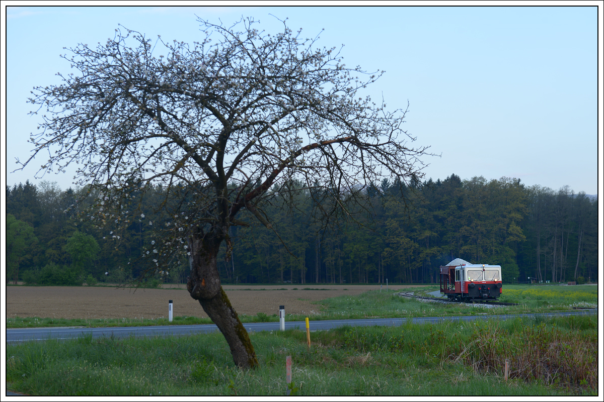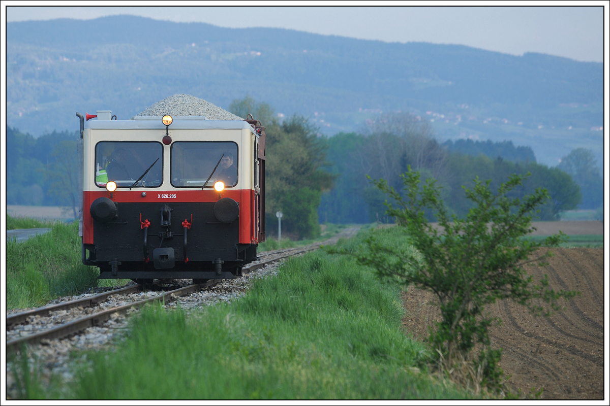 X 626.205 der Stainzerbahn am 27.4.2020 mit einem Schotterzug von Stainz nach Kraubath wenige Meter vor dem Ziel. NAch einem wunderschönen Sonnenaufgang rund eine Stunde vor Aufnahme der Bilder, hat sich leider am Horizont ein Wolkenband vor die Sonne geschoben, aber ich finde die Bilder trotz fehlender Sonne doch stimmig. Hanspeter Reschinger