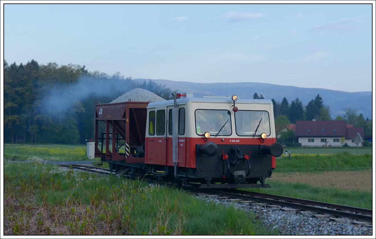 X 626.205 der Stainzerbahn am 27.4.2020 mit einem Schotterzug von Stainz nach Kraubath, aufgenommen kurz vor der Haltestelle Herbersdorf. Hanspeter Reschinger
