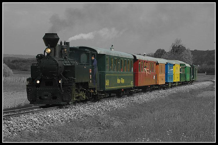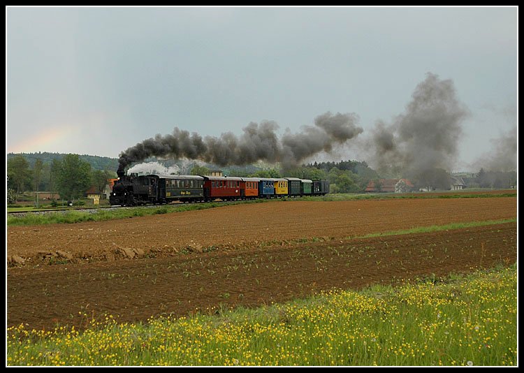 Bei der Rückfahrt des  Stainzer Flascherlzuges  am 13.5.2006 ging kurz ein heftiger Regenschauer nieder. Mit dem Ansatz eines Regenbogens im Hintergrund, der Zug zwischen Herbersdorf und Stallhof.