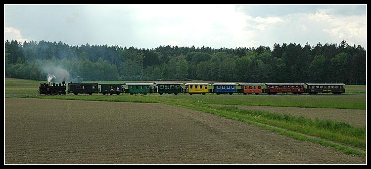 Der „Stainzer Flascherlzug am 13.5.2006. Aktuell steht dort bei Dampffahrten die ehemalige rumänische Waldbahnlokomotive 764.411 Model Resita Nr. 619 BJ 1986 im Einsatz. Die S 11, die lange Jahre Dienst auf der Strecke zwischen Stainz und Preding-Wieselsdorf versah, steht zur Zeit nicht betriebsbereit im Lokschuppen in Stainz. Auf dem Bild befindet sich der Zug bereits auf der Rückfahrt von Preding nach Stainz im Bereich Wohlsdorf. Falls jemand die gesamte Reportage vom 13.5.2006 sehen will: http://www.bahnwelt.net/forum/thread.php?threadid=1365