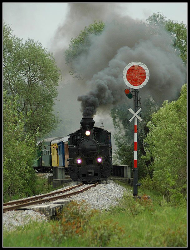 Der „Stainzer Flascherlzug am 13.5.2006. Aktuell steht dort bei Dampffahrten die ehemalige rumänische Waldbahnlokomotive 764.411 Model Resita Nr. 619 BJ 1986! im Einsatz. Die S 11, die lange Jahre Dienst auf der Strecke zwischen Stainz und Preding-Wieselsdorf versah, steht zur Zeit nicht betriebsbereit im Lokschuppen in Stainz. Am Foto befindet sich der Zug kurz vor Herbersdorf. Falls jemand die gesamte Reportage sehen möchte http://www.bahnwelt.net/forum/thread.php?threadid=1365