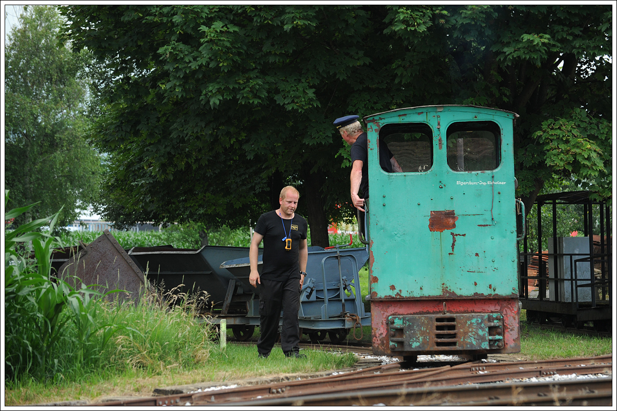 Tag der offenen Bahnhofstür bei der Stainzer Lokalbahn am 25.6.2016. Mein fotografischer Schwerpunkt bildete diesmal die umfangreiche Feldbahnanlage, auf der an diesem Tag Besucherfahrten stattgefunden haben. Hier Karl-Heinz und Tono beim Fachgespräch vor der nächsten Fahrt. Hanspeter Reschinger