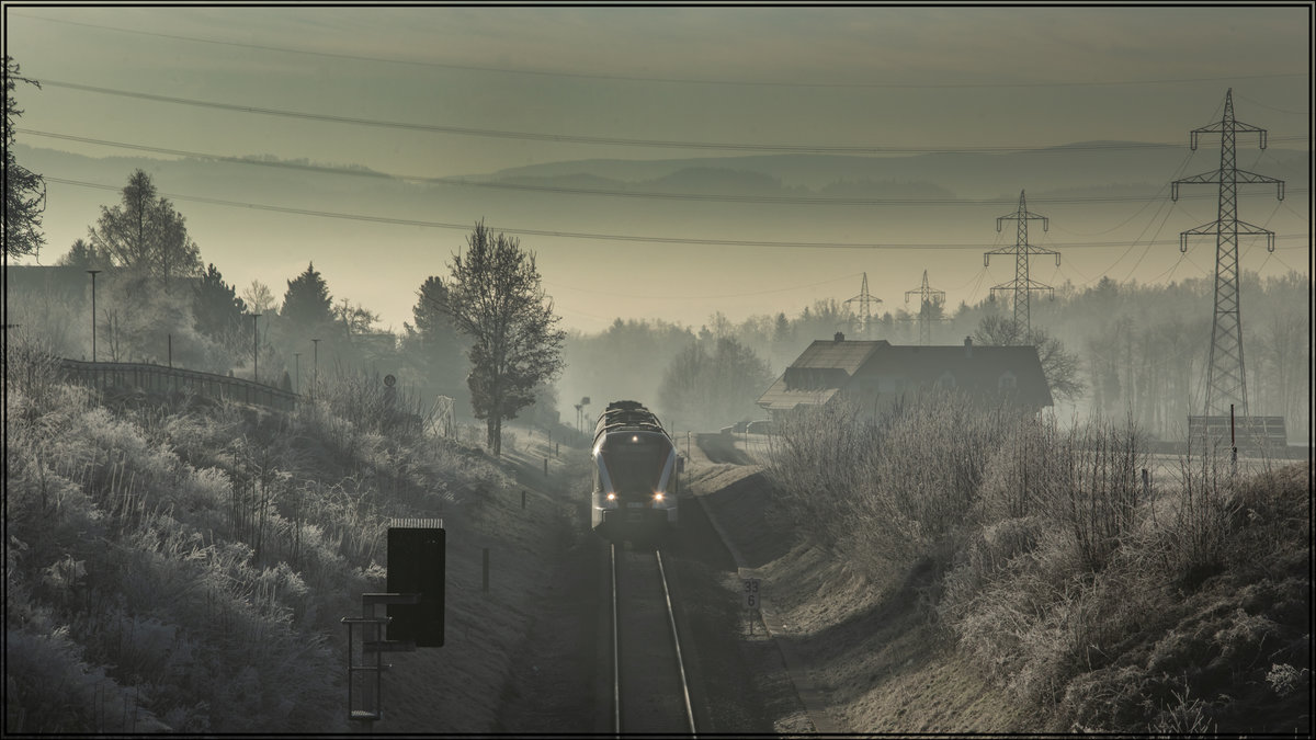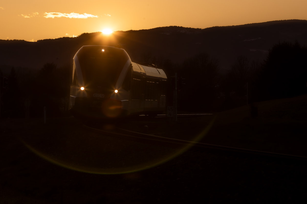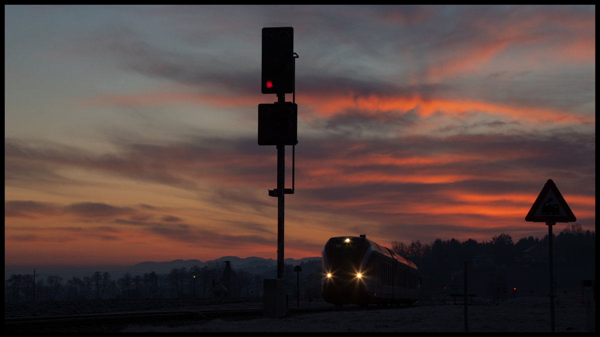 Die letzten Sonnenstrahlen versuchen am 19.12.2019 durch die Wolken zu kommen als der 5081.55 als SLP96001 in der Betriebsausweiche Autal steht und auf die Weiterfahrt nach Fehring wartet. Autal war bis 2010 eine Haltestelle und wurde durch die Haltestelle Hart bei Graz ersetzt Max Kiegerl