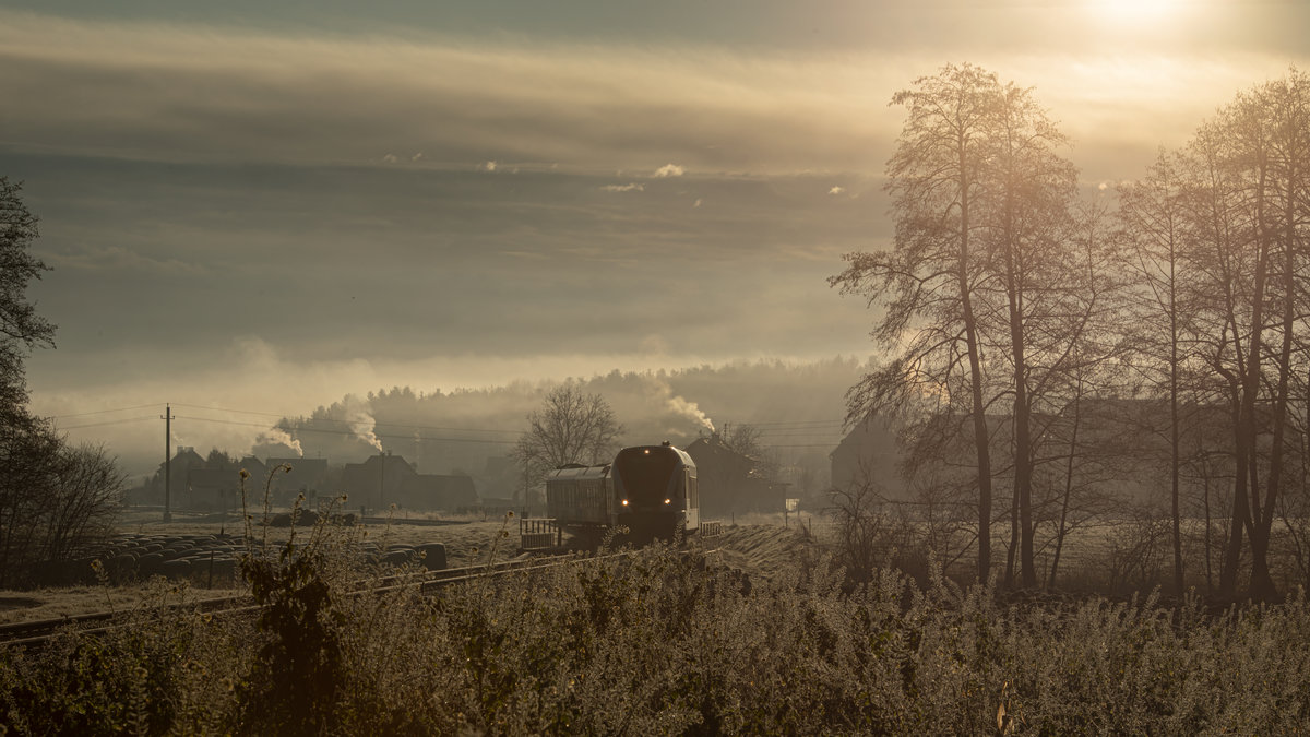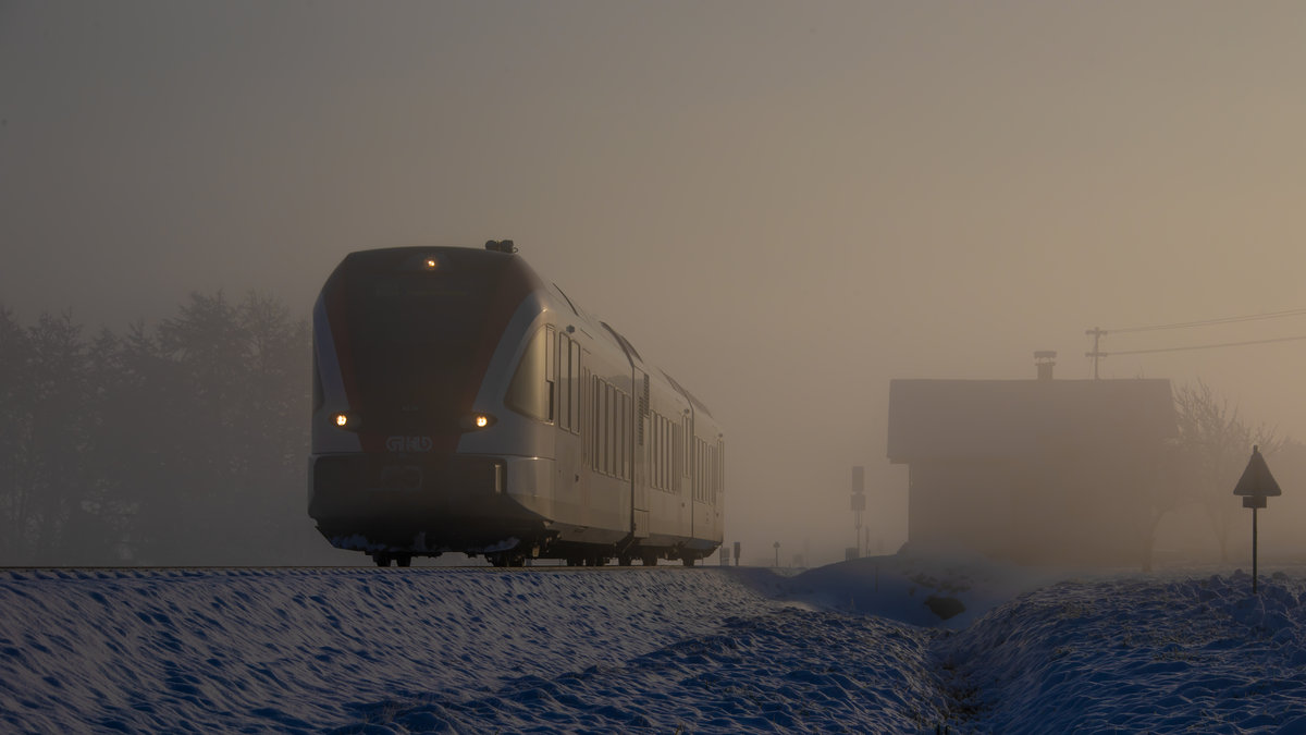 Im Morgen Nebel verlässt dieser GTW2/8 den Bahnhof St. Martin im Sulmtal Bergla