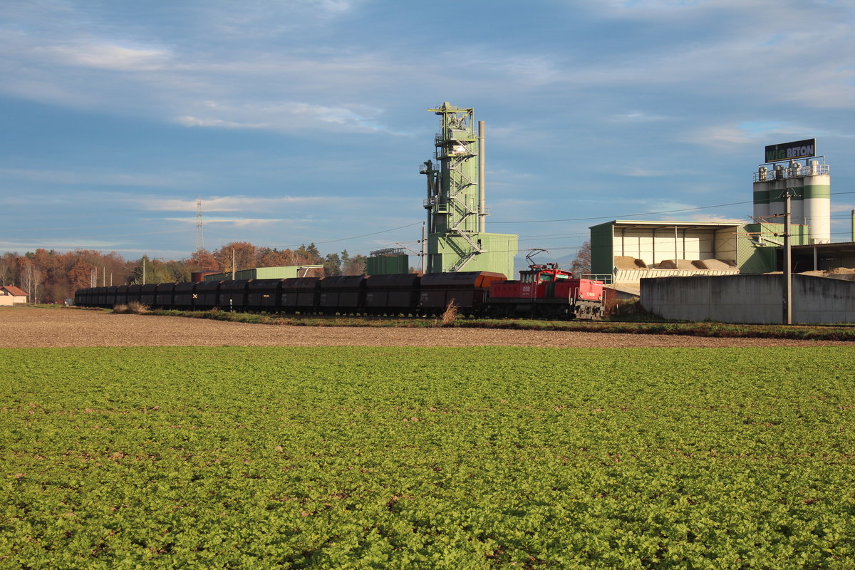 Am 7.11.2015 wirft sich die 1063 016 mit der Bedienfahrt BED75773 von Werndorf zum Fernheizwerk Mellach in den Bogen vor der Kulisse des Werndorfer Zementwerks.