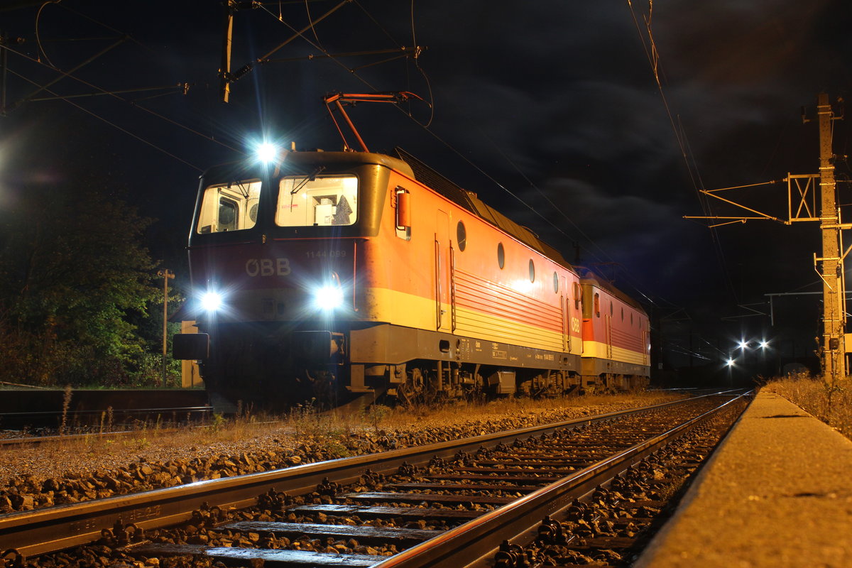 In der Nacht von 24. auf 25.10.2018 stehen die 1144 099 und 1144 246 als GLZ87698 im Bahnhof Eichberg und warten auf die Weiterfahrt nach Gloggnitz.
