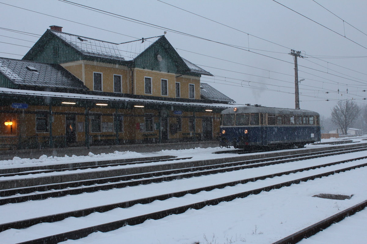 Bei heftigem Schneefall am 15.12.2019 steht der 5081.55 als E14095 im Bahnhof Admont und wartet auf die Abfahrt in Richtung Graz.