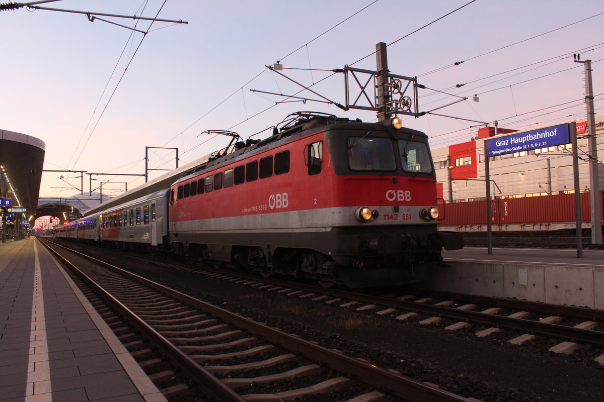 Die schon betagten aber immer noch sehr zuverlässigen Triebfahrzeuge der Reihe 1142 kommen immer noch häufig im Regionalverkehr mit "CityShuttle" Wendezügen zum Einsatz oder auch immer wieder vor Schnellzügen. Hier steht am Morgen des 24.10.2019 die 1142 651 mit dem R4110 von Spielfeld-Straß nach Graz Hbf im Zugendbahnhof und wartet auf die Verschubfahrt in die Abstellgruppe.