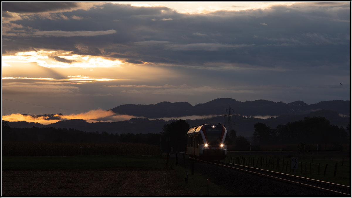 Sonnenaufgang über dem Laßnitztal. Einer der schönsten Streckenabschnitte für Sonnenaufgänge ist jener zwischen Groß Sankt Florian und Frauental . September 2019