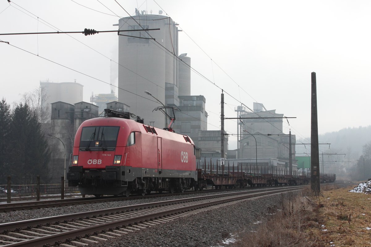 Am 30.1.2019 steht die 1116 143 mit dem GAG47692 von Spielfeld-Straß nach Kindberg im Bahnhof Retznei in der nebeligen Südsteiermark. Im Hintergrund sind die Anlagen der Lafarge Zementwerke GmbH zu sehen die einen Gleisanschluss besitzen und regelmäßig Güterwagen bekommen. Max Kiegerl