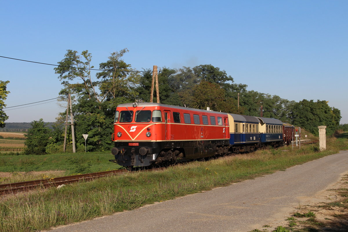 Der morgendliche GmP (Güterzug mit Personenveförderung) bespannt mit 2050.09 beschleunigt am 15.9.2019 aus der Haltestelle Raggendorf und erklimmt in Kürze den Raggendorfer Berg am Weg nach Gänserndorf. Max Kiegerl