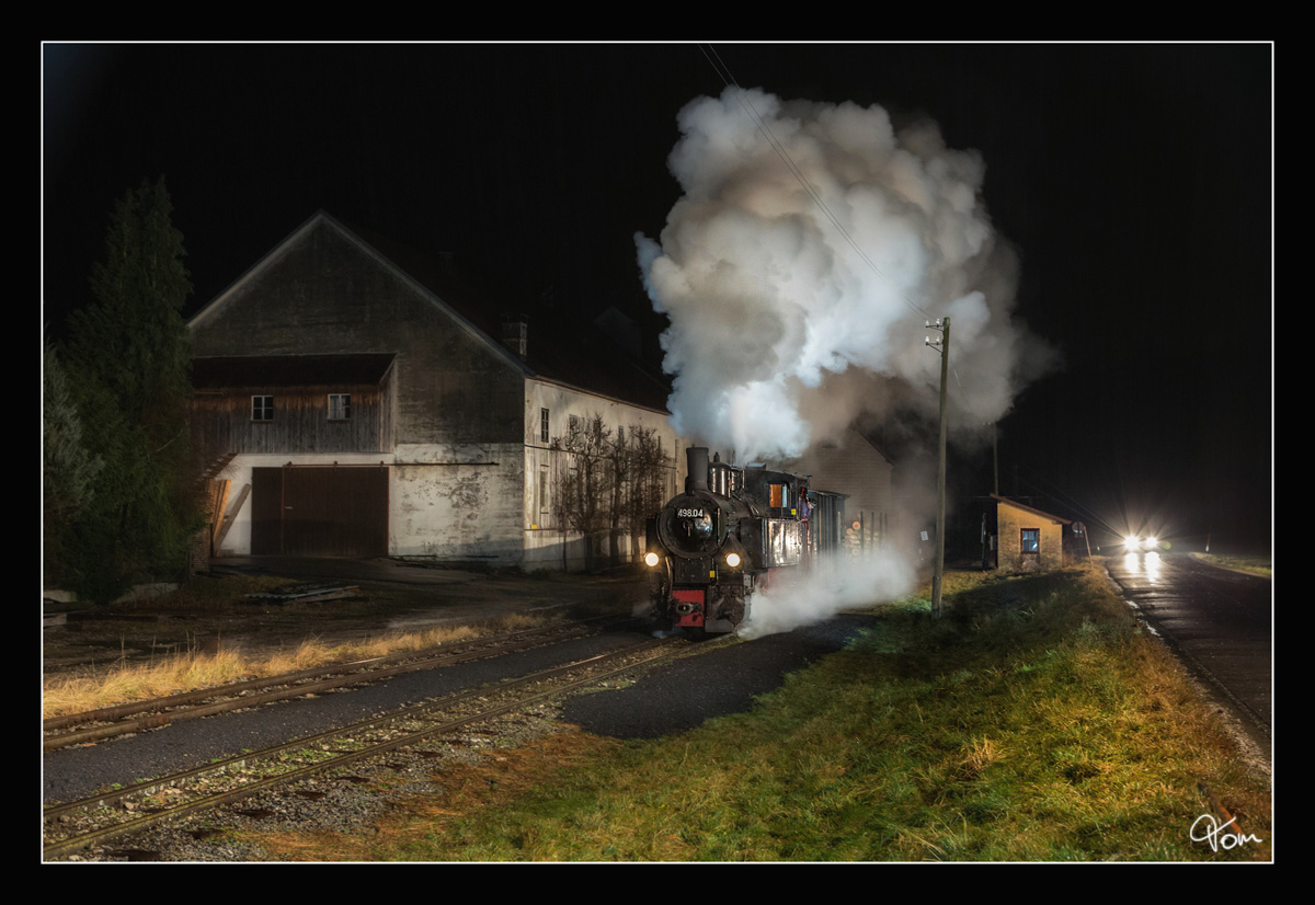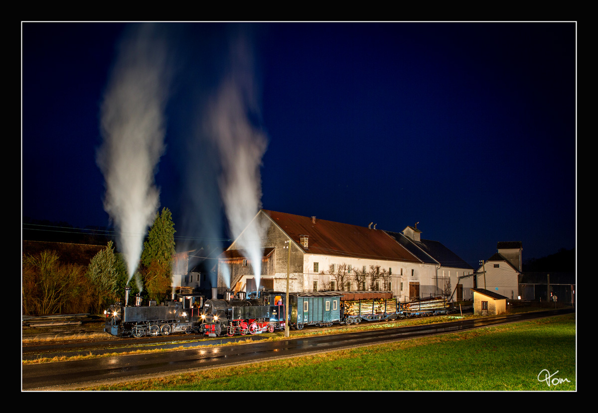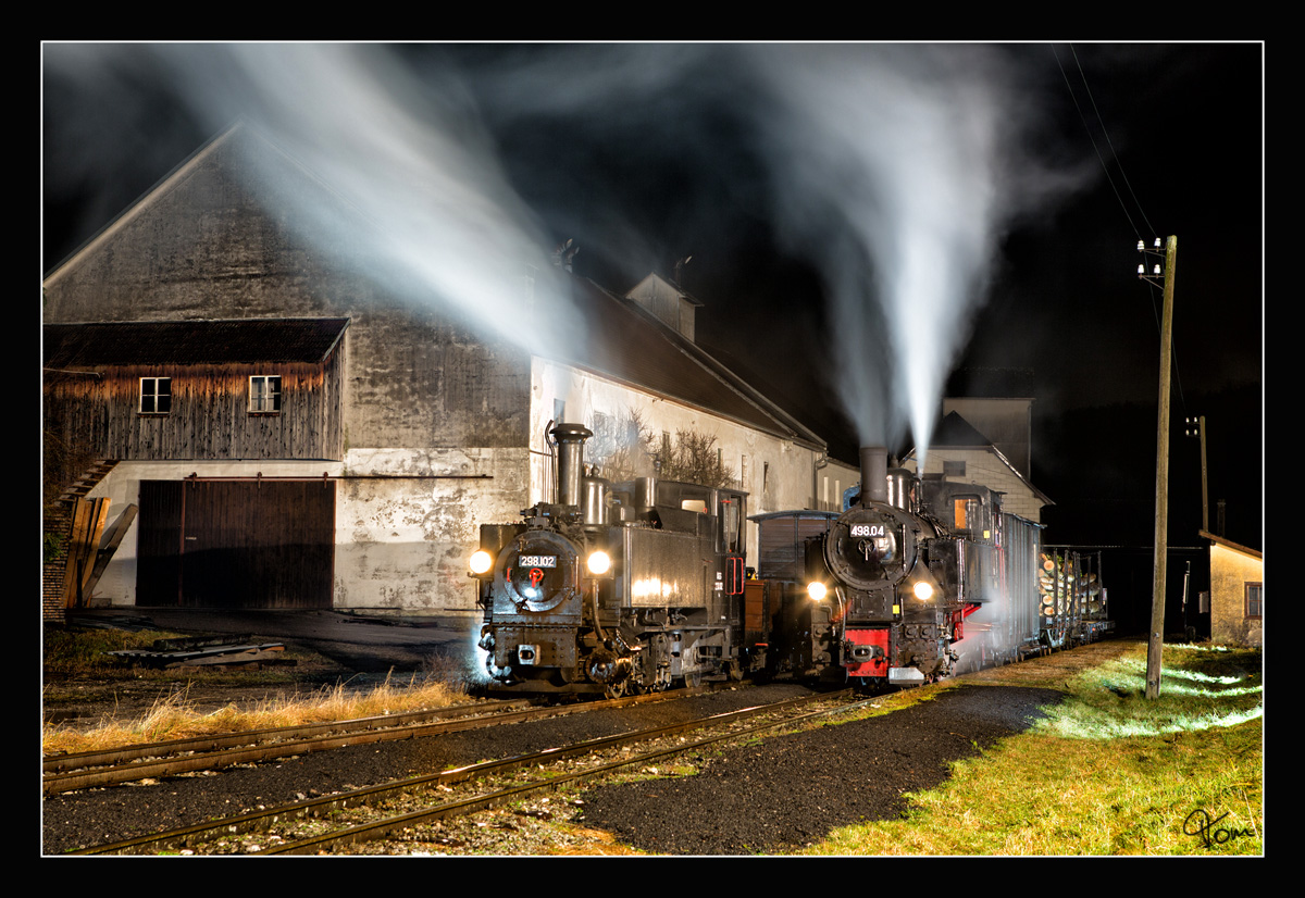 Nachtaufnahme der beiden Steyrtal Dampfloks, 498.04 und 298.102 in der Haltestelle Sommerhubermühle. Bei der ÖBB 298.102 handelt es sich um die im Jahr 1888 gebaute, ex Steyrtalbahn 2 "Sierning"