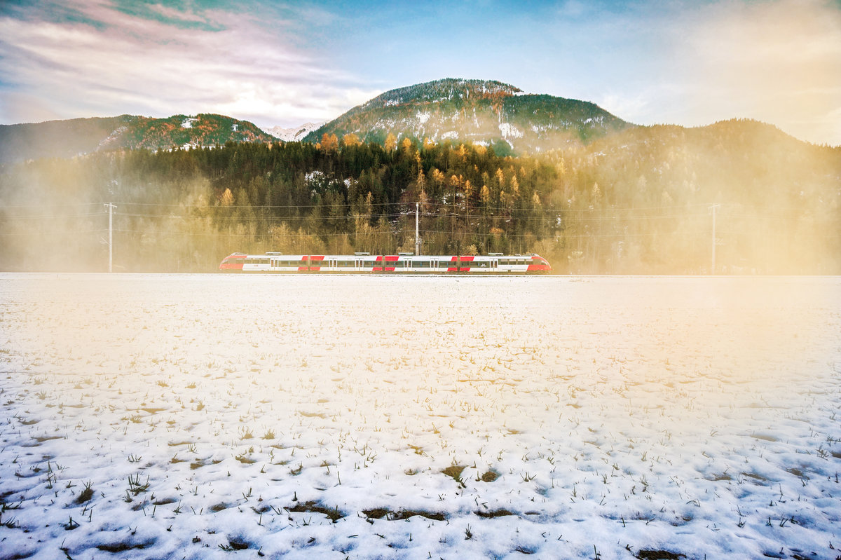 Die letzten Sonnenstrahlen des Tages scheinen bei Berg im Drautal nochmal durch den Nebel, während ein 4024 vorüber fährt. Die Garnitur war unterwegs als S1 4233 (Friesach - Lienz). Aufgenommen am 11.11.2017.