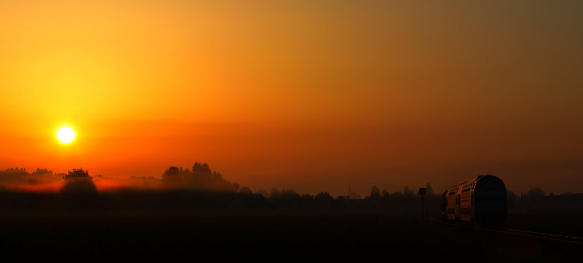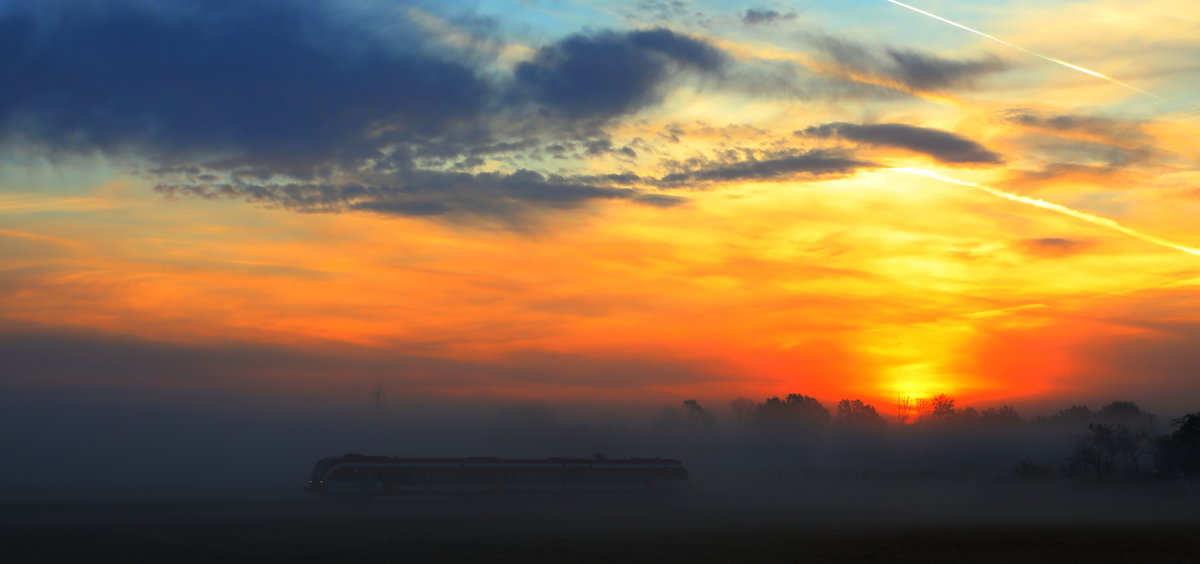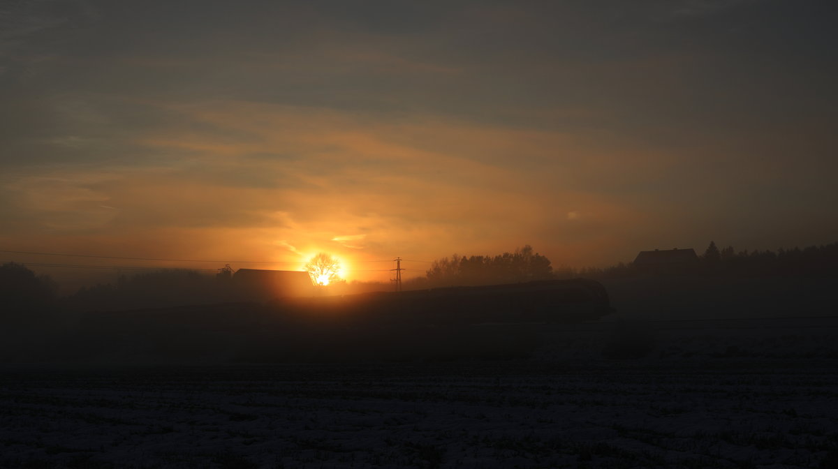Die letzten Sonnenstrahlen des Tages scheinen bei Berg im Drautal nochmal durch den Nebel, während ein 4024 vorüber fährt.