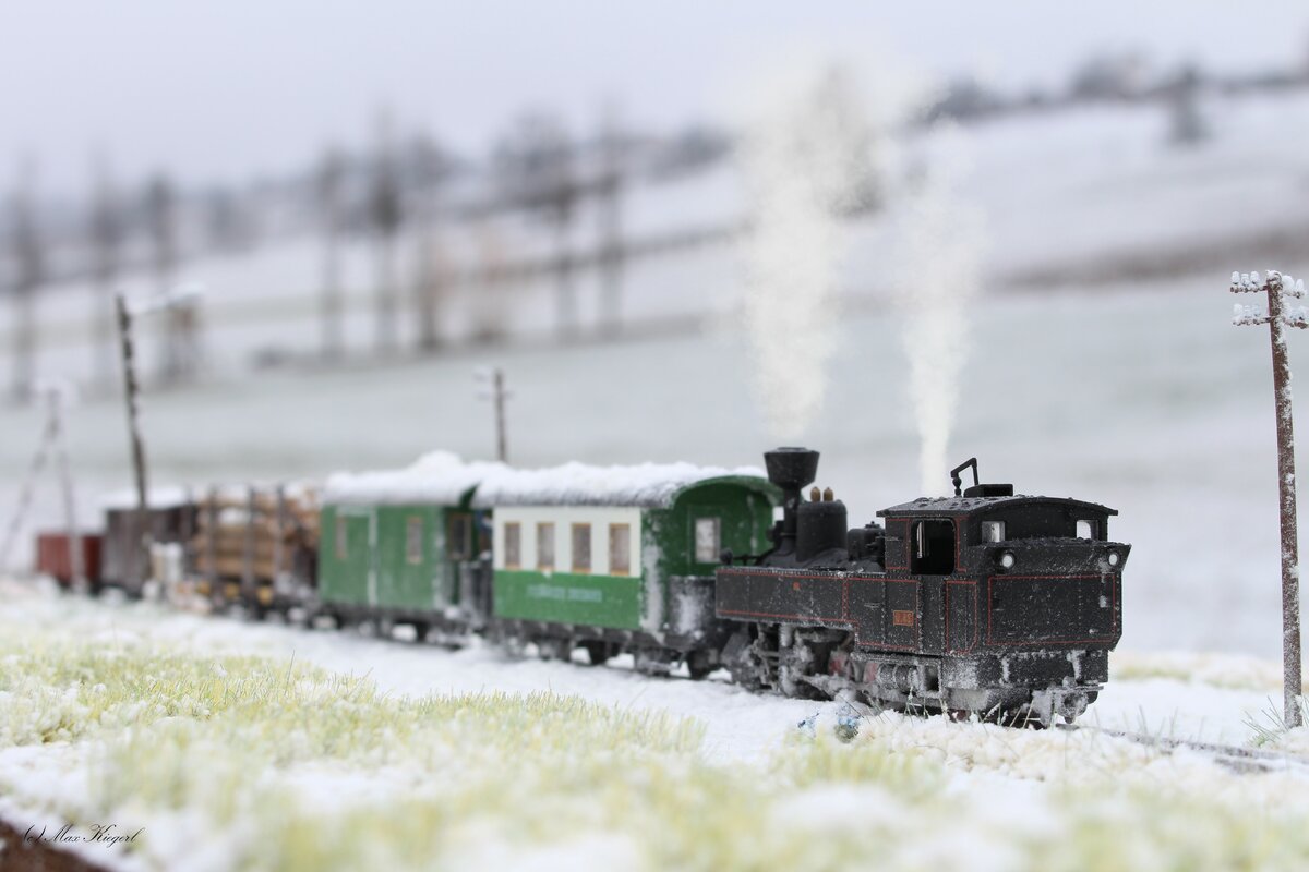 Mit dem nachmittäglichen FW33 von Frauental-Bad Gams nach Wildbach beschleunigt an einem kalten und schneereichen Jännertag 1979 aus der Haltestelle Geipersdorf-Wildbachberg dem Ziel entgegen. Max Kiegerl