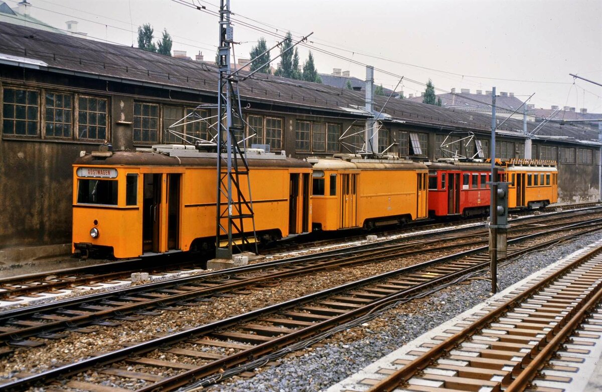Und hier genau das Richtige für echte Stadtbahnfans: ATW 6898, ATW 6899, ATW 6890 und ein ABW vor dem Betriebsbahnhof Michelbeuern (Wiener Elektrische Stadtbahn), 16.08.1984 Frank Nowotny