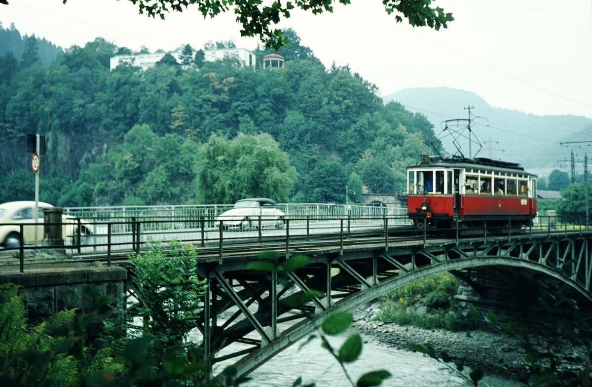Straßenbahn Innsbruck__Mittelgebirgsbahn__Gut gefüllter Zug der Linie 6 kurz vor Igls. Am Zugschluß Bw 102 [Graz 1900]. Viele Fahrgäste stiegen an einem der Badeseen (Mühlsee, Lanser See) aus.__10-08-1972 Klaus-Erich Lisk
